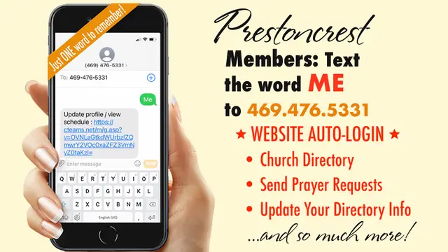 If you have placed membership at Prestoncrest, text the word “ME” to 469-476-5331 to get started. Click the link that is sent back to you. Scroll through the menu of items you receive for great links, resources, searchable church directory, and automatic-login to the website to see the FULL church bulletin each week.